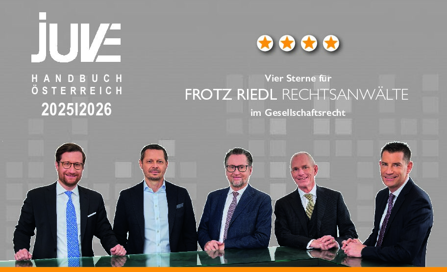 The JUVE Handbook Austria 2025/2026 has once again given Frotz Riedl Rechtsanwälte an excellent rating this year: according to JUVE, the firm is highly renowned for its work in corporate law, particularly in complex corporate law matters and also in disputes. The partner-centred advisory services are highlighted. Stephan Frotz is once again named as one of the leading names in Austria in corporate law. Clemens Spitznagel and Paul Schörghofer are also described as established figures in the market. According to JUVE, Paul Schörghofer is, as in recent years, one of the rising stars in the field of M&A/corporate law. Also mentioned are the new contract partners Stefan Hammerschmidt and Florian Wünscher, who are already active in the market with their own clients, and our youngest lawyer, Nikolaus Feldscher, who is already receiving praise from the market for his work in corporate law.